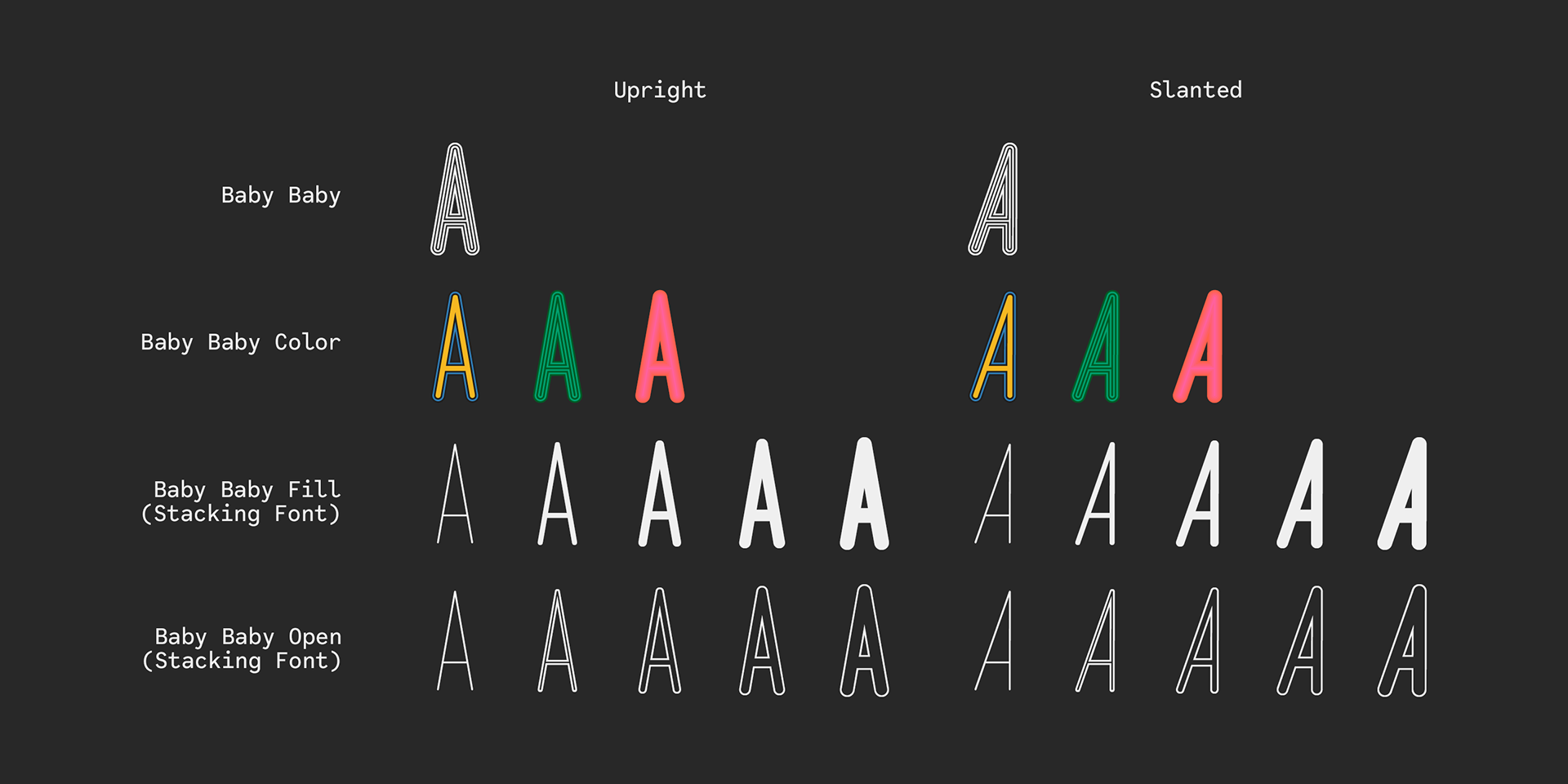 - The Baby Baby Fill family decomposes these stripes into five distinct mono-line styles, each expanding the stem width in equal intervals.
