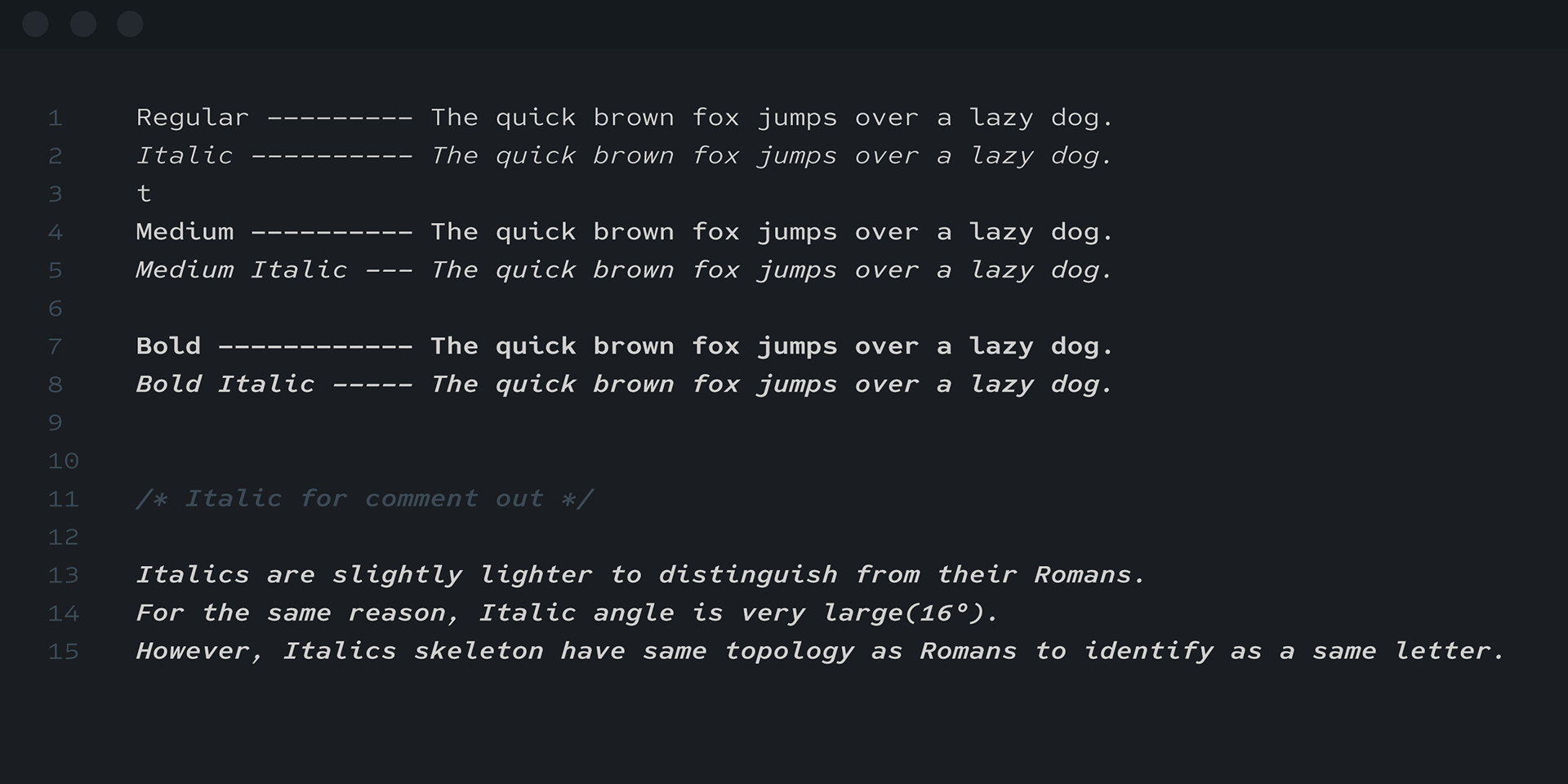 The italic styles feature a pronounced slant angle to ensure clear differentiation from the upright Roman styles. They are also slightly lighter in weight to enhance contrast, and are deliberately non-cursive—opting for a slanted Roman form instead. This choice supports clarity in programming contexts, where cursive forms can interfere with code legibility.